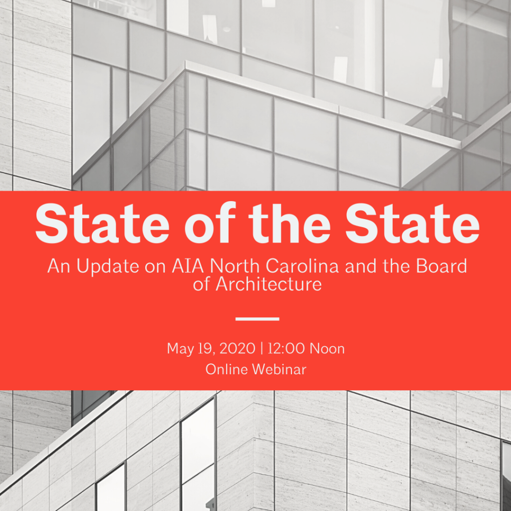 During this discussion, we will hear about relevant updates regarding the field of architecture in our state, including legislative and regulatory updates from David Crawford, as well as potential economic impacts of COVID-19. Catherine will cover updates relevant to licensure and the North Carolina Board of Architecture.